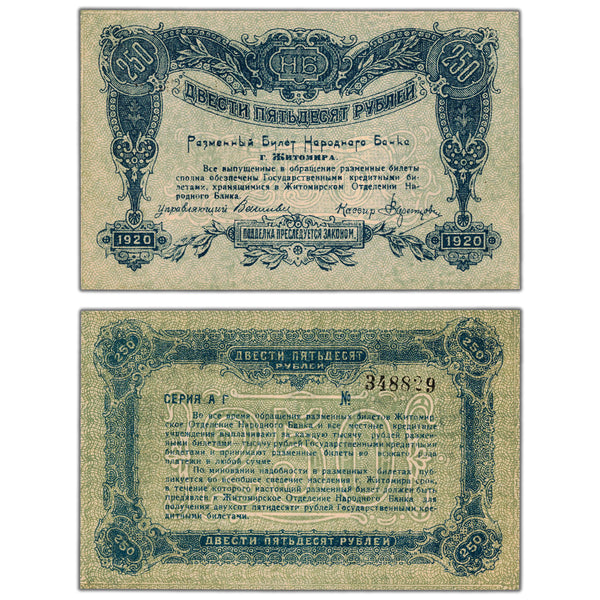 SOLD Ukraine Zhytomyr 1920 250 Roubles Note P #S347 - UNC