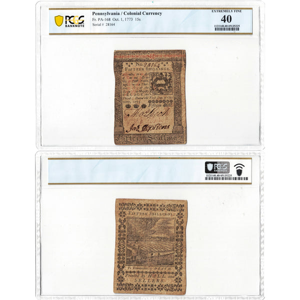 United States 1773 15 Shillings Pennsylvania Colonial Currency Note Fr. PA-168 - PCGS EF-40
