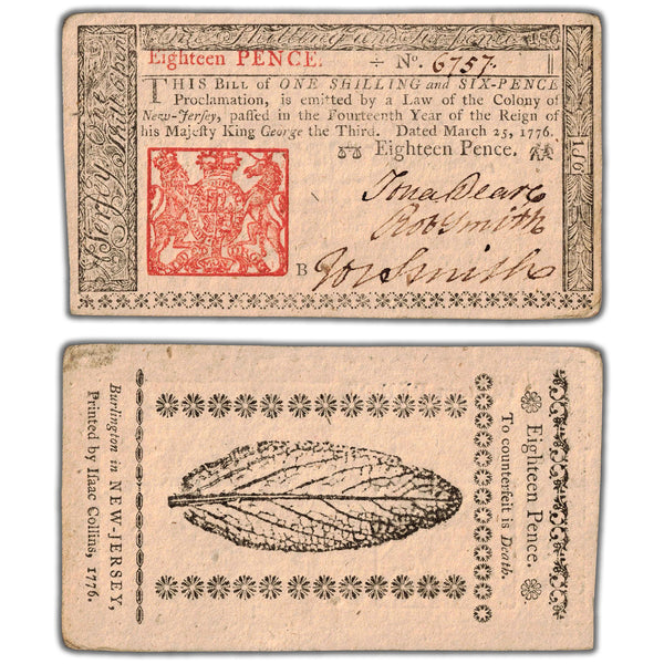 SOLD United States 1776 18 Pence New Jersey Colonial Currency Note Country: United States - New Jersey Year: 1776 Denomination: 18 Pence Variety: Colonial Currency Serial/SKU: 6757
