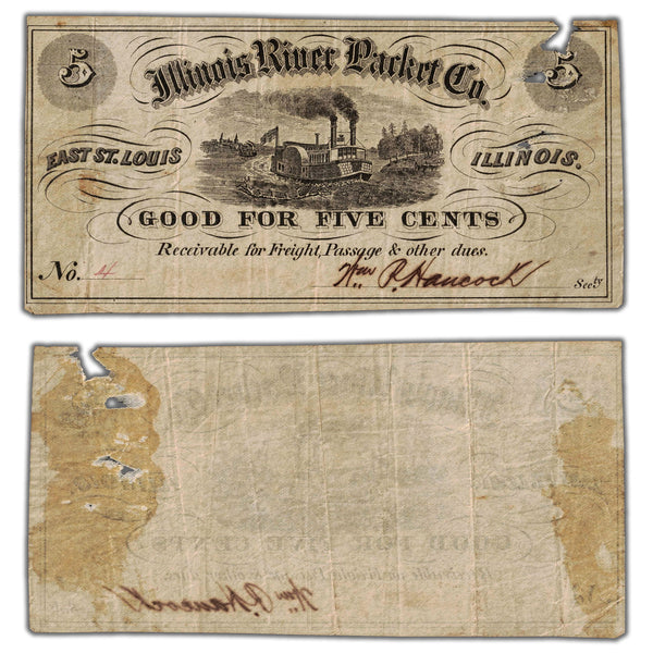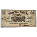 Available for sale is a United States 1850-60's Illinois River Packet Co. 5 Cents Note - Damaged