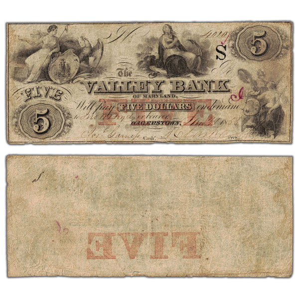 United States 1855 The Valley Bank MD $5 Five Dollars Obsolete Note - Pinholes
