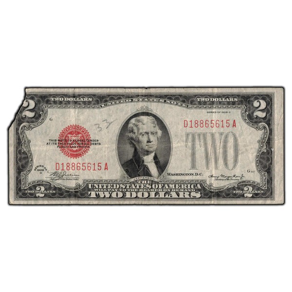 SOLD United States 1928-D $2 Red Seal Note - Missing Corner/Writing