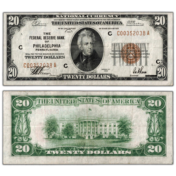 SOLD United States 1929 $20 Philadelphia, PA National Currency Note - VF/EF Country: United States - Philadelphia, PA Year: 1929 Denomination: 20 Dollars Variety: National Currency Grade: VF/EF Serial/SKU: C00352038A