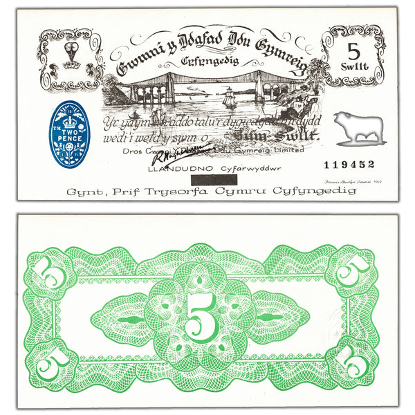 Available for sale is a Wales Black Sheep Company 1969 5 Swllt Note Serial/SKU: 119452